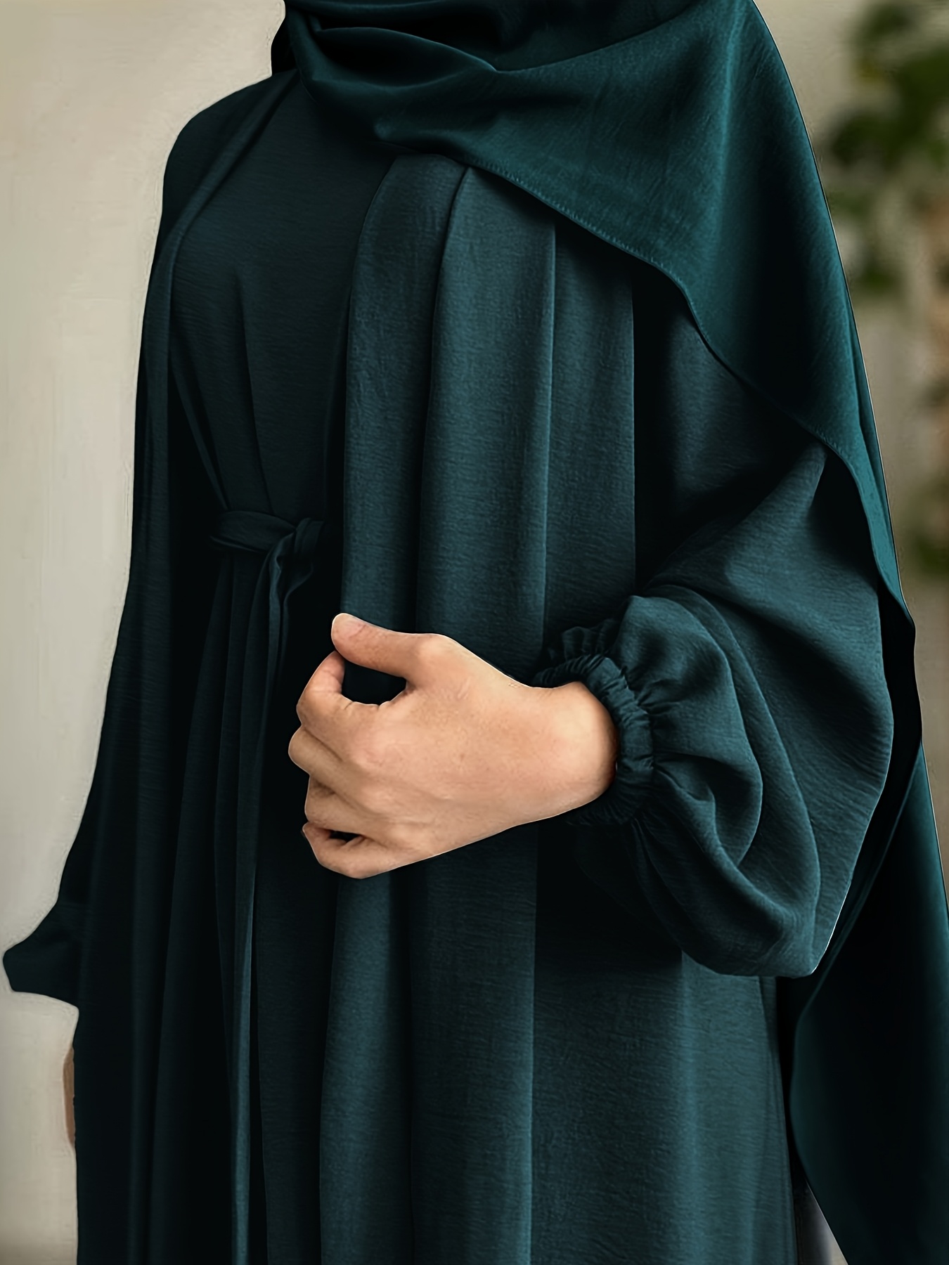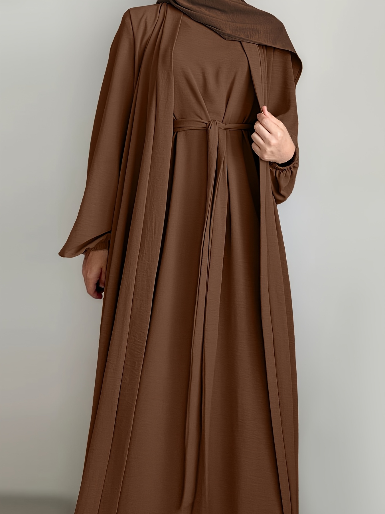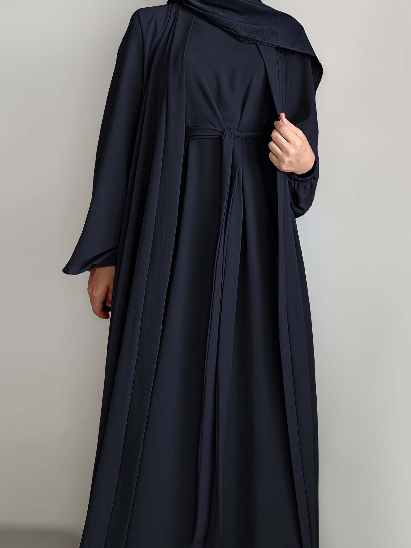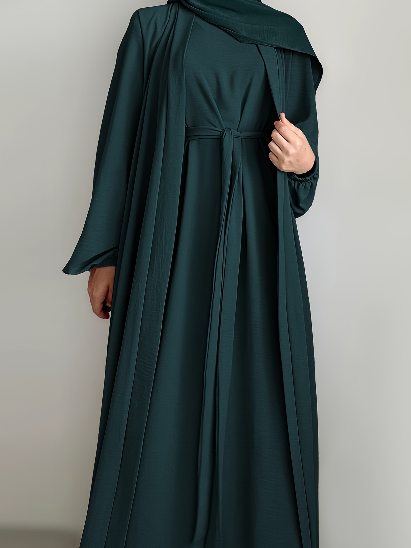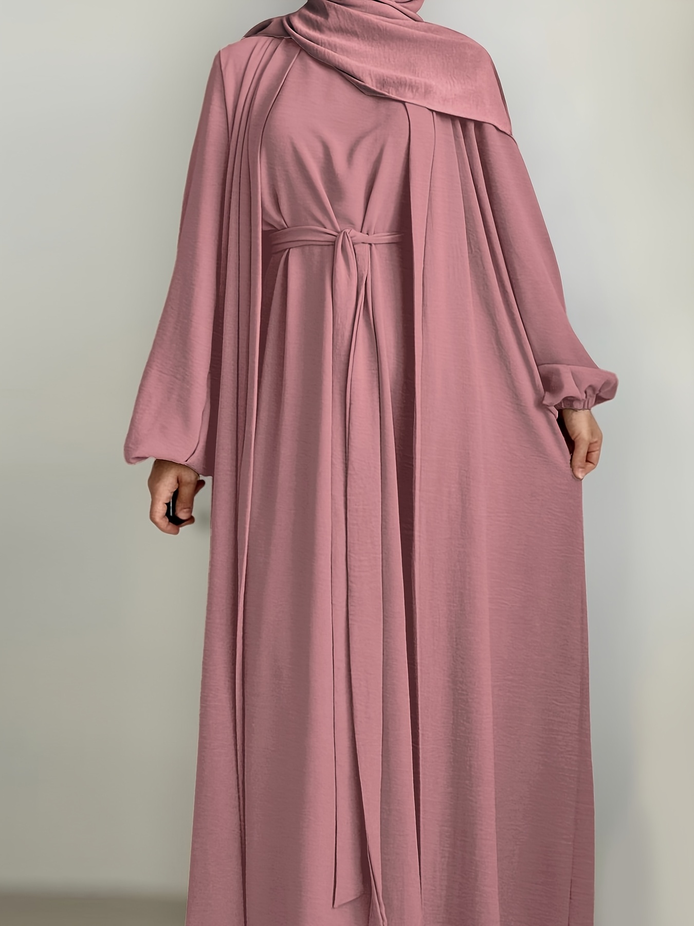 3pcs Traditional Middle Eastern Abaya Dress Set - Long Sleeve, Belted Waist, Solid Color, Non-Stretch Fabric, Spring/Summer/Fall Wear, Includes Cardigan, Dress, and Headscarf, Cultural Attire|Traditional Attire|Belted Waist D