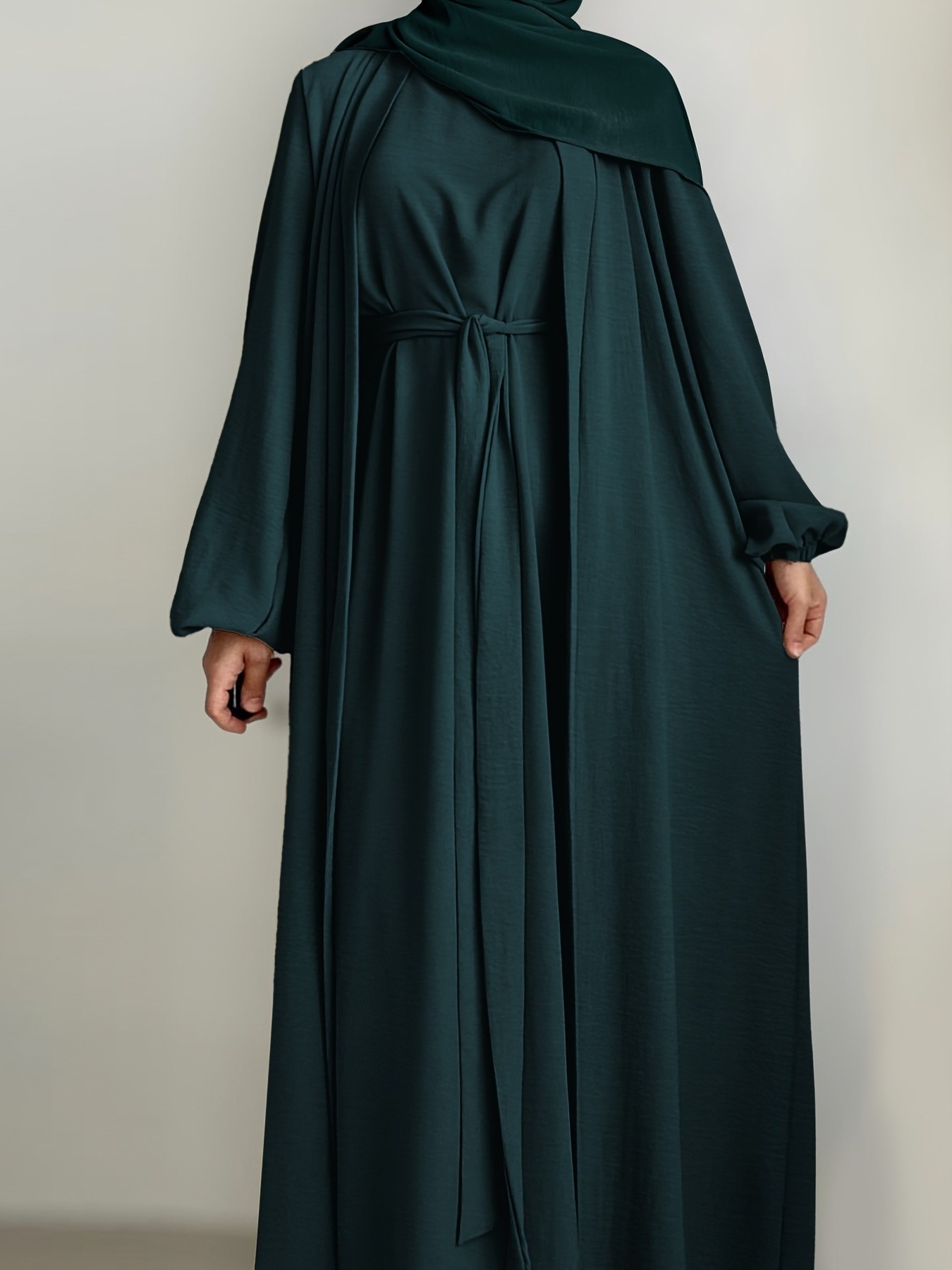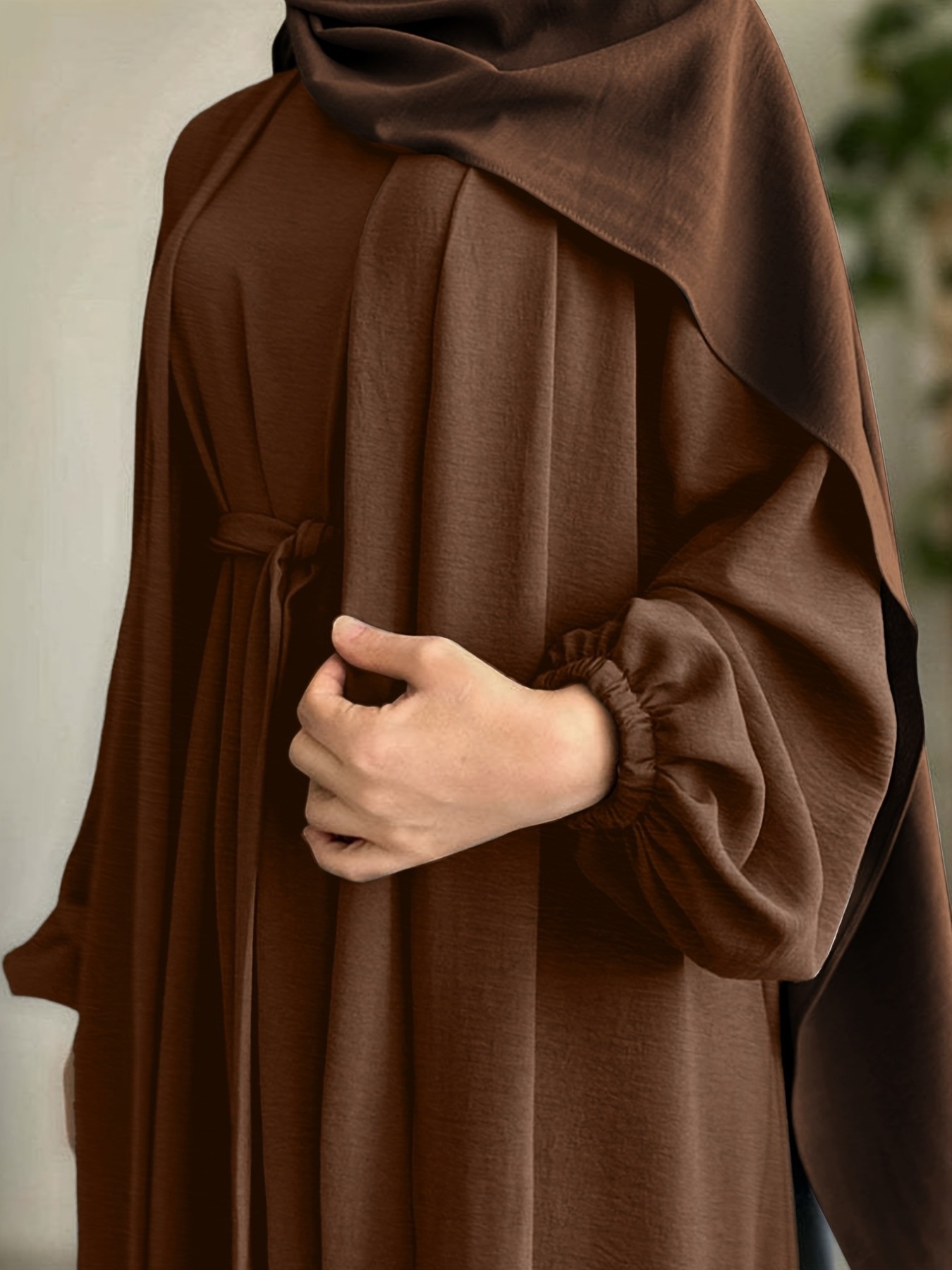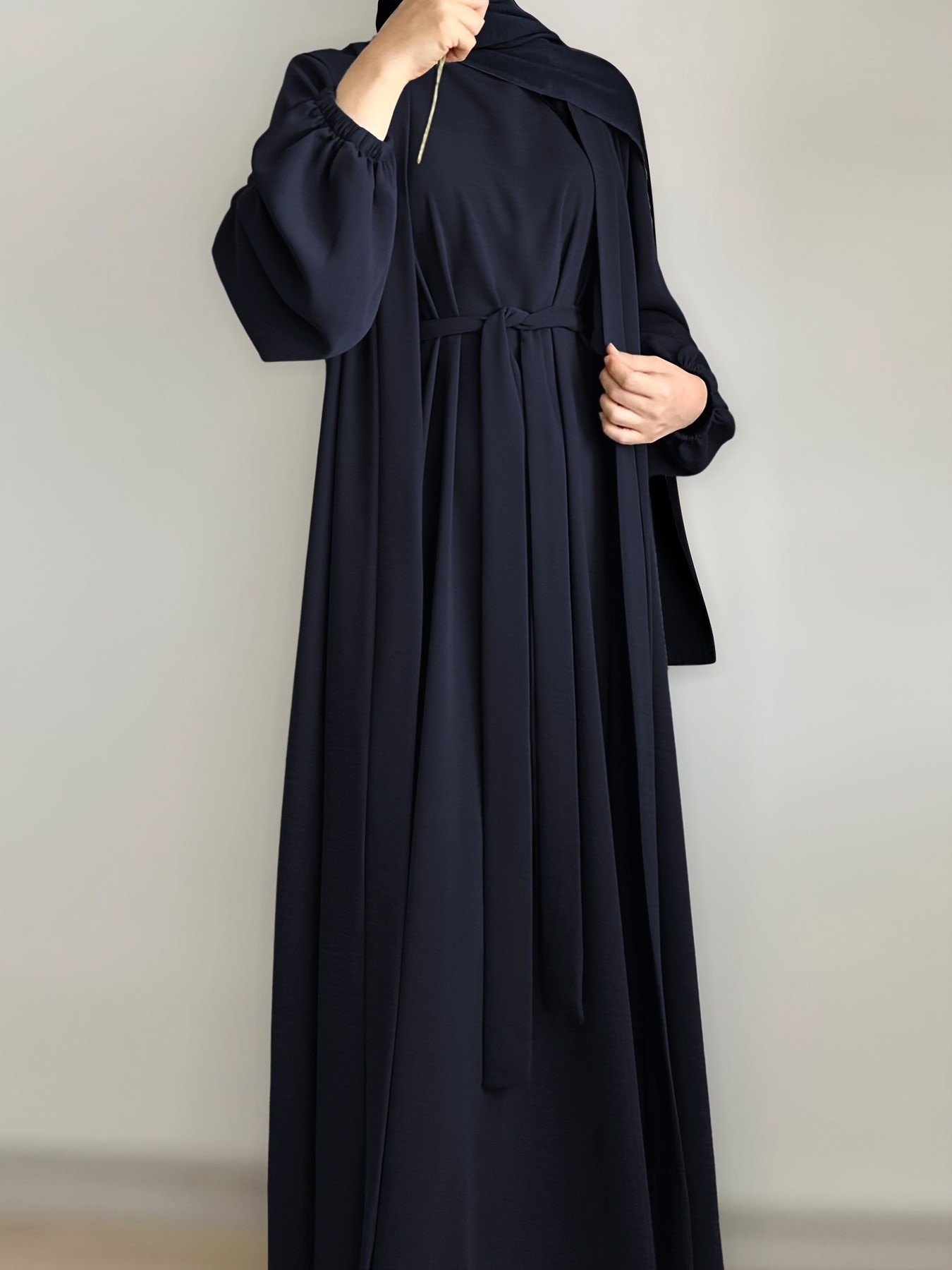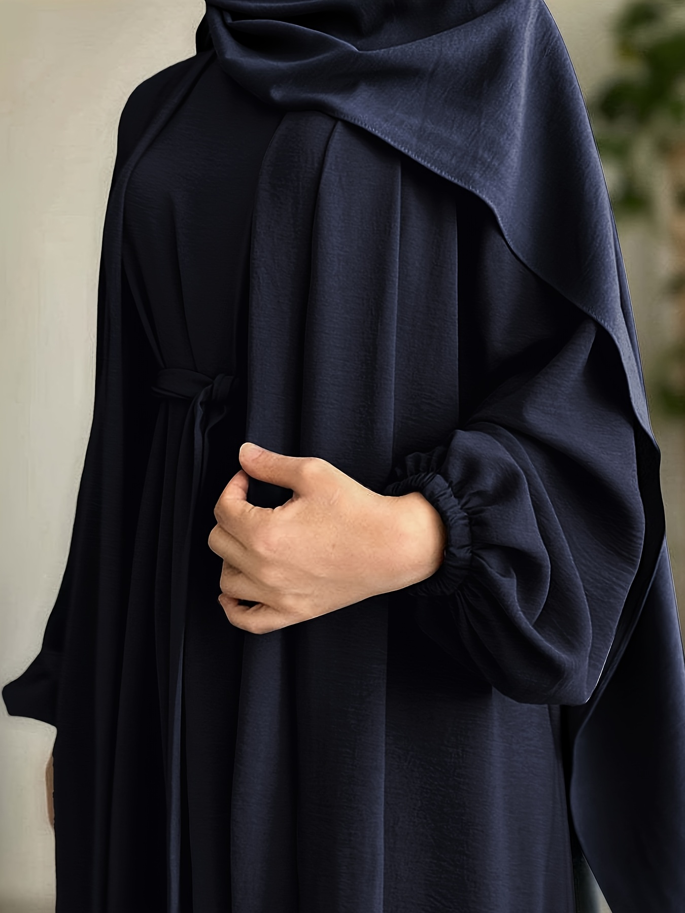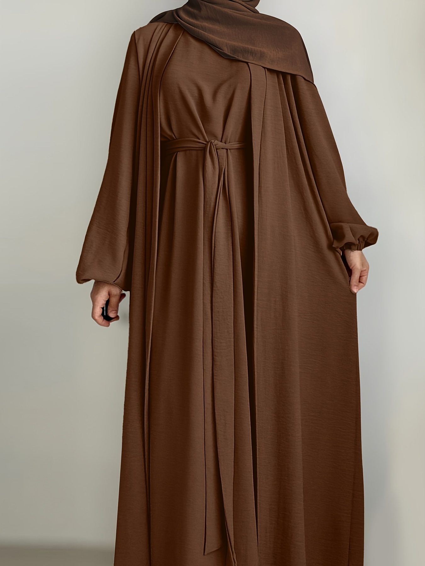 3pcs Traditional Middle Eastern Abaya Dress Set - Long Sleeve, Belted Waist, Solid Color, Non-Stretch Fabric, Spring/Summer/Fall Wear, Includes Cardigan, Dress, and Headscarf, Cultural Attire|Traditional Attire|Belted Waist D